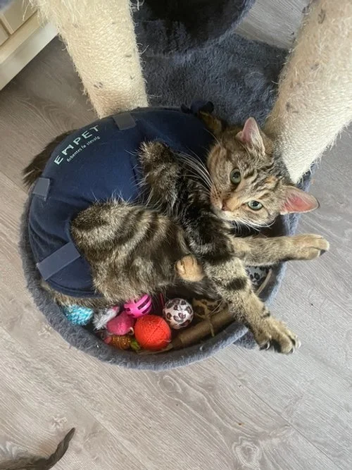 Jeg er ei nydelig lita, brun tabby jente, som ble hentet inn da jeg ikke hadde så så bra.