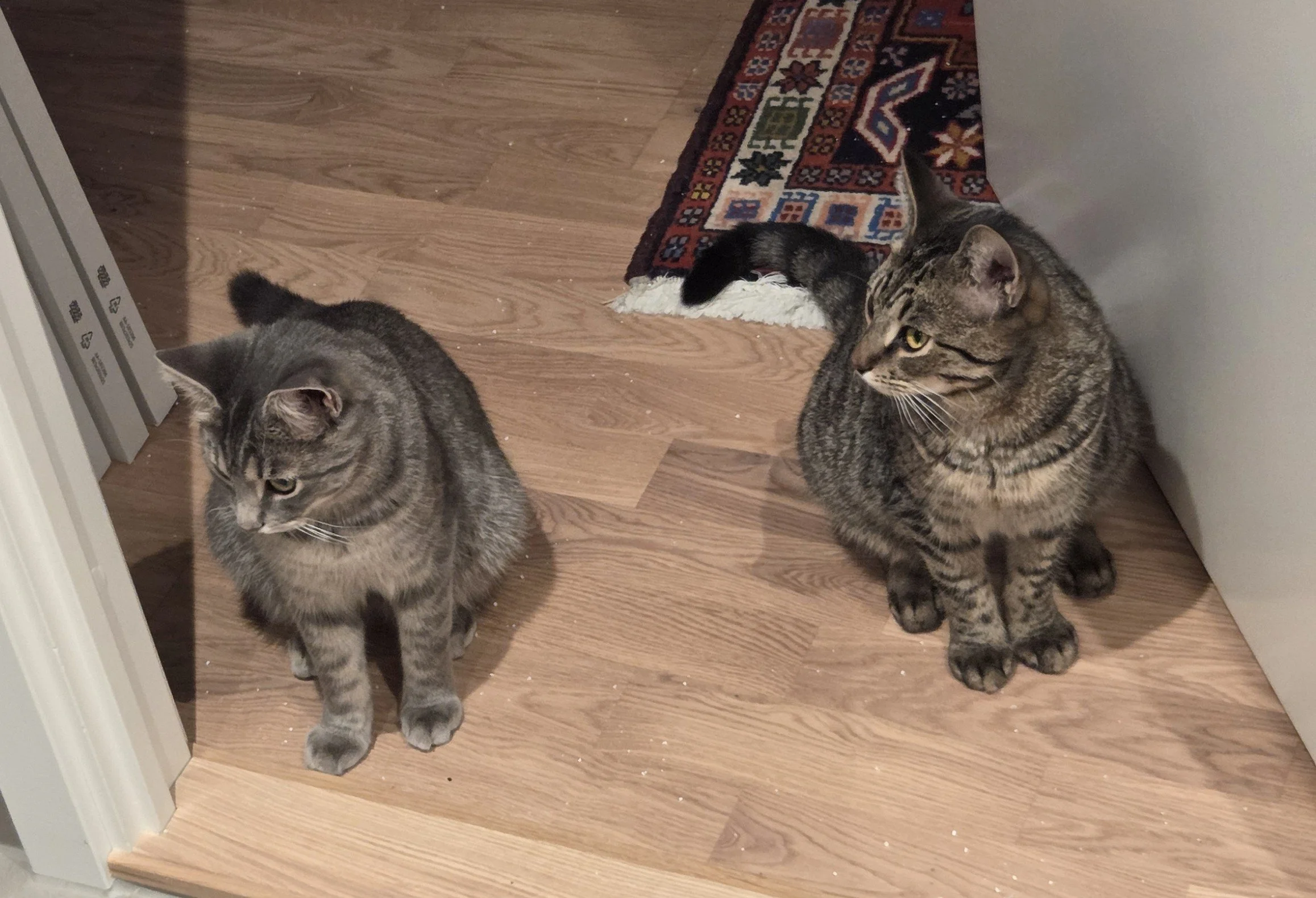 Vi ble hentet inn fra en stor koloni på 14 katter(!!) i Østfold i høsten 2025, og var i et fosterhjem med mange andre katter frem til desember, da vi fikk et fosterhjem helt for oss selv. Vi var livredde i starten - gjemte oss under sofa, seng, klesskap, alt vi kunne skvise oss under - men så var den fjær-leken veldig interessant da... Og snacks var jo godt det også.. Og så må jo NOEN passe på fostermor når hun går på do og legger seg om natta og går ut døra om morgenen...